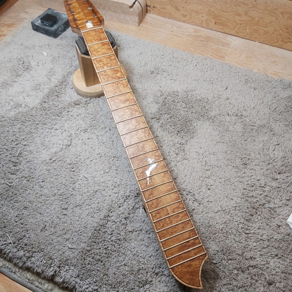 Like many modern luthiers, James has also been exploring new materials as sustainability and supply challenges continue to influence the world of instrument building. One of those materials is Obsidian Ebony, a resin-infused maple developed as an alternative to traditional ebony.
